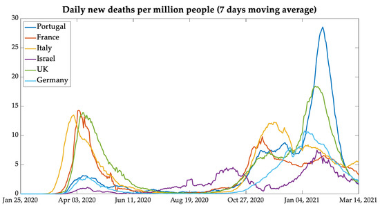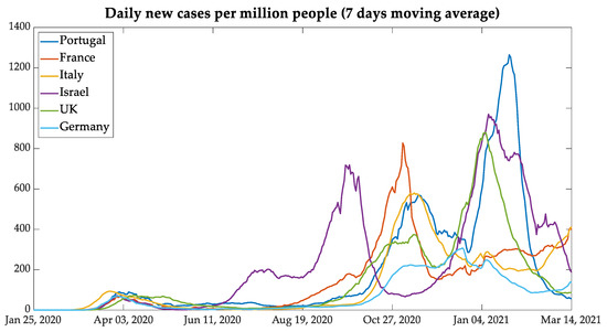 After the data were normalized per million people and smoothed with a seven-day moving average, Figure 3 and Figure 4 display the behavior of the contamination and deaths due to COVID-19 as seen in the six countries. It is possible to point out the three waves of daily new infections and deaths of European countries and the four waves in Israel. The waves in European countries are more or less synchronized, but Israel shows a different behavior. The chosen group of countries, composed by the five European countries and Israel, was defined to verify the results of similar mitigation procedures that were adopted by the European Union and the United Kingdom, as well as Israel since this country has a procedure that was more advanced in vaccination.