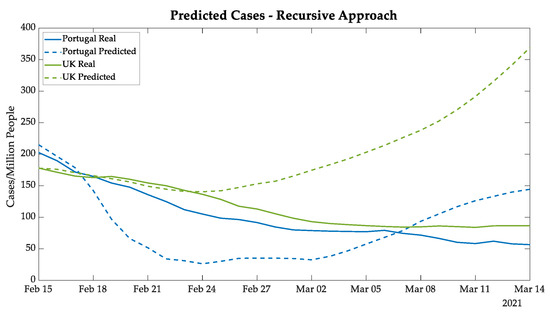 The results of Portugal and the UK were analyzed together, considering that the B 1.1.7 COVID-19 variant already represents 82.9% of the Portuguese nationwide cases [21]. In spite of this, the mass vaccination campaign in the UK is showing itself to be faster than the Portuguese campaign, resulting in a divergence of real and forecasted values [31].