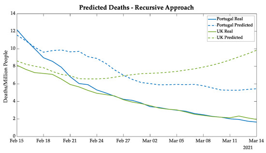 New deaths predicted for Portugal and the UK using the recursive approach.