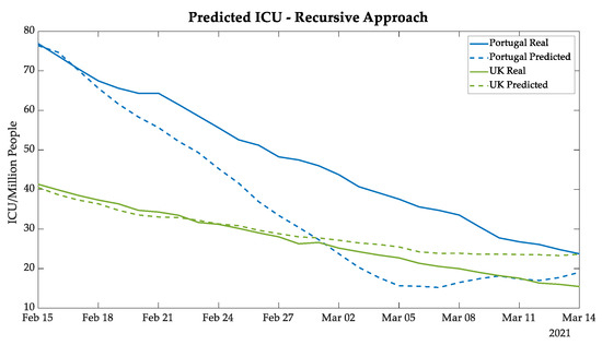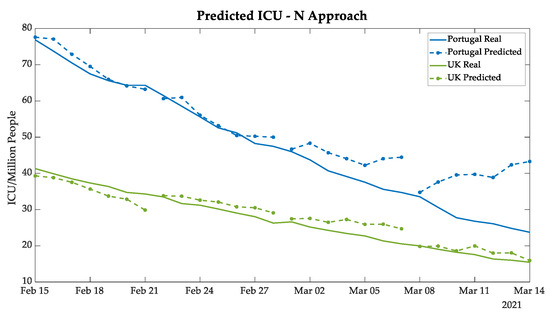 Analyzing the UK prediction, in Figure 9, Figure 10 and Figure 11 the results of the UK demonstrate that the N approach was better in forecasting than the recursive approach, considering that it followed the tendency of new cases, deaths, and daily ICU patients, without a substantial gap as demonstrated in the previous approach. The comparative analyses of the two approaches are discussed in Section 3.5.