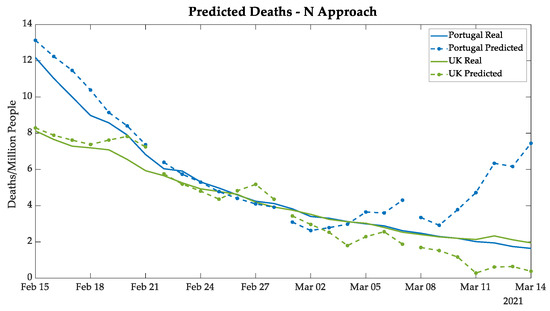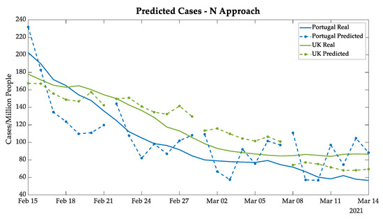 The greatest advantage of the N approach is that it does not accumulate errors by iteration, since the prediction is directly obtained from real data. However, since it used a limited database, the main error source came from the values of the daily variation, even with the moving averages. The tendency of new cases in Portugal and in the UK, shown in Figure 9, had a significant variation among days, as expected due to the variation in the training data. Nevertheless, the UK prediction behaves quite well.