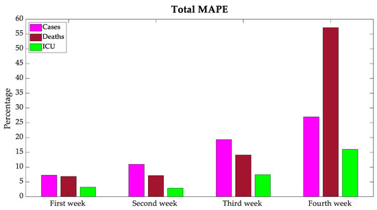 It is important to highlight that a high percentage error can also be associated with the scale under evaluation. The biggest percentage errors presented in Table 4 is related to deaths, which represent the smallest predicted values. The relative measure of MAPE needs to be read carefully, considering that for low real values, a small absolute error may induce a very high value of MAPE, as it is the case for the number of deaths in the fourth week ahead.