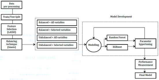 Continuing onto a brief description of these algorithms, Random Forest is a combination of Decision Tree algorithms and Bagging, where both belong to supervised analysis. Together, they train a model to predict the class of the target variable with earlier knowledge of the output values deduced from prior data []. The other technique used, XGBoost, combines Boosting and Gradient Boosting algorithms. Boosting sequentially the corrects the errors committed by the previous models, which wrongly classified the elements, while Gradient Boosting tries to modelize the residuals, that is, transform the errors into a function to avoid overfitting []. We chose these algorithms because these were the most suitable for the dataset and also for the binary class of the target. In addition, they achieved the best results among the other models, based on alternative machine learning algorithms, such as Naive Bayes, Support Vector Machine and Artificial Neural Network. In particular, XGBoost is becoming popular in machine-learning competitors and data scientists, as it has been battle tested for production on large-scale problems [].