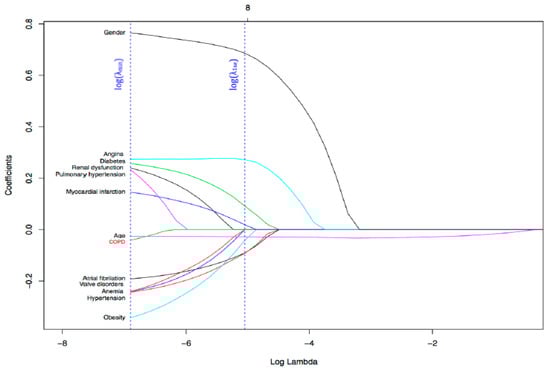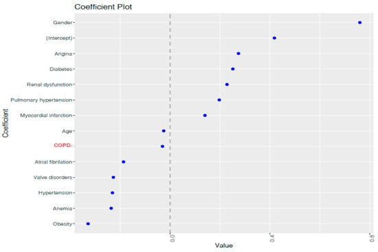 To define the most convenient λ value, the λ that maximizes the area under the curve (AUC) was selected. In Figure 3, the two vertical lines indicate two optimum log(λ) values: the first one from the left corresponds to log (λmin), the value that maximizes the AUC model’s, while the second corresponds to log (λse). Afterwards, we built a model setting λ at λmin, and the variables whose coefficients were greater or lower than 0 were the predictor variables selected for the final model. The coefficient values associated with each variable: age (−0.02), gender (0.76), atrial fibrillation (−0.18), angina (0.27), hypertension (−0.23), valve disorders (−0.22), diabetes (0.25), anemia (−0.23), COPD (−0.03), pulmonary hypertension (0.19), obesity (−0.32), renal dysfunction (0.22) and myocardial infarction (0.14), Figure 4. These values represent the contribution of each covariate to the endpoint, with the highest value having the highest importance.