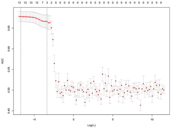 Using the training set, AUC values and its 95% confidence intervals for different logarithmic values of λ represented on x-axis, where λ is the regularization parameter in the model. Vertical lines correspond to Log(λmin) and Log(λse) which are the most optimal Log(λ) values.