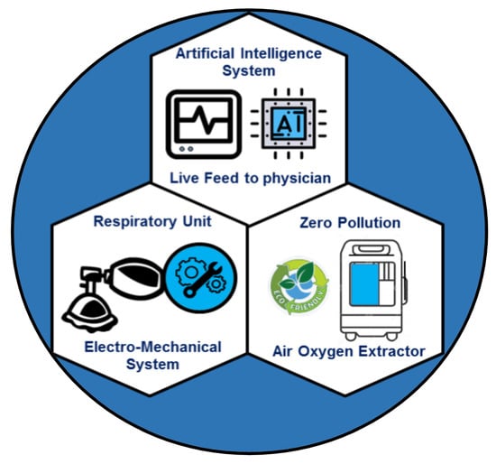 Few attempts [160,161,162] have been made to minimize the cost and portability of the ventilators with limited success. Recently, a novel portable ventilator design has been proposed that eliminates the non-ambulatory bottle-neck of the current ventilators. It aims to provide a low-cost, smart, and a portable ventilator under the brand name VENTIBAG [163]. The core component schematics of the VENTIBAG is presented in Figure 3. It comprises of three major components: (a) respiratory unit, (b) oxygen extractor, and (c) artificial intelligent controller.