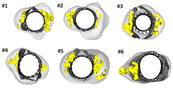 Figure 4 highlights the deformed configurations of implanted THVs for each stenotic bicuspid patient. We observed that the THV stent frame was characterized by a slightly elliptical shape at aortic annulus to accommodate the oval bicuspid anatomy in Patient #4 and #6. In other patient cases, the stent frame had a circular shape at the implanted configuration. Indeed, the degree of THV deformity is highly variable from patient to patient, with relevant frame distortions caused by the amount and position of calcifications with respect to the aortic root wall. It can be clearly observed that Patient #6 with right-left fusion bicuspid phenotype had remarkable distortion of the THV frame at the sinus of Valsalva. In a different way, the large annulus size of Patient #3 led to a more circular configuration of the deployed THV. This was likely caused by the large dimension of the aortic valve annulus of Patient #3 so that the device was implanted in the proximal left ventricular outflow tract (implantation depth of 12.5 mm).