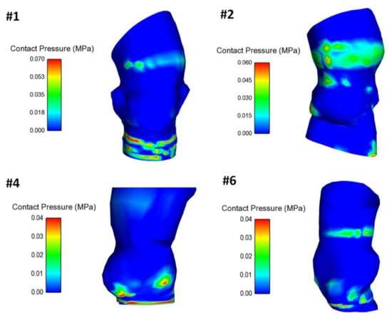 Distribution of the contact pressure between the inner aortic wall surface and the deployed THV for four patients.