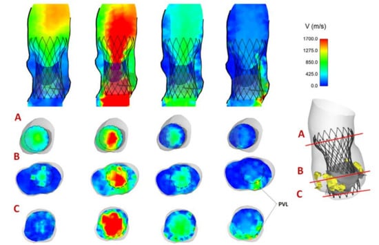Maps of flow velocity were assessed at cross-section of the vessel and at different analysis planes, including the aortic annulus inflow, mid-height and outflow from the device. Figure 6 shows the flow velocity maps for Patient #5 with a trivial presence of PVL. Specifically, the velocity contour map of Patient #5 in different planes shows a mean central flow jet during acceleration and peak systolic phase when prosthetic valve leaflets are opened. Although the THV leaflets are closed at late diastole, two minor regions of PVL can be observed near the commissures of native BAV leaflets. In a different way, Figure 7 illustrates the blood flow map for Patient #2 with no presence of PVL at diastole.