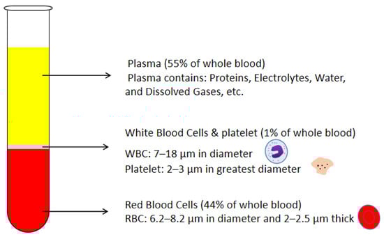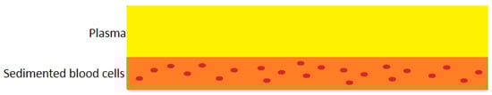 Sedimentation is one of the oldest separation approaches based on the gravity and the density differences between plasma and blood cells (ρRBCs=1100 kg/m3, ρWBCS= 1050–1090 kg/m3 and ρplasma=1030 kg/m3), the principle is shown in the Figure 9. Sedimentation velocity of blood cells in the whole blood is varied with patients’ sex and health conditions []. The biggest limitation of sedimentation technology is the low separation velocity, and it is out of consideration when facing a large volume of the blood sample. However, with a small amount of blood, such as finger prick, it is still a popular technology. Hybridizing the sedimentation technique with filtration advantageously minimizes clogging issues inherent to microfiltration [,]. Most blood cells sediment before reaching the filtration region, the plasma could be continuously extracted and a few suspension blood cells are separated away by the filter.