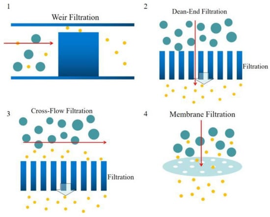 Schematics of the microfiltration types, (1) weir filtration (side view), (2) dead-end filtration (top view), (3) cross- flow filtration (top view), (4) membrane filtration (side view).