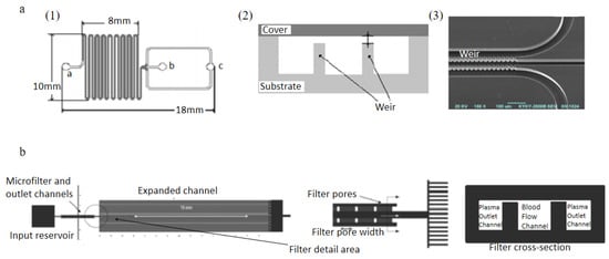 Applications of weir-type filtration, (a): schematic view of the silicon substrate, “a” is the inlet, “b” is the outlet for WBCs, “c” is the outlet for RBCs (1); cross-section of the weir-type barrier (2); SEM micrograph of the channel close to the outlet (3); (b) microfiltration design of Crowley et al. [,]. (a) reprinted from Sensors and Actuators B: Chemical, Volume 130, Issue 1, Xing Chen, Da Fu Cui, Chang Chun Liu, Hui Li, Microfluidic chip for blood cell separation and collection based on crossflow filtration, 216–221, Copyright (2007), with permission from Elsevier. (b) republished with permission of The Royal Society of Chemistry, from Lab on a Chip, Isolation of plasma from whole blood using planar microfilters for lab-on-a-chip applications, Timothy A. Crowley and Vincent Pizziconi, 5, 2005; permission conveyed through Copyright Clearance Center, Inc.