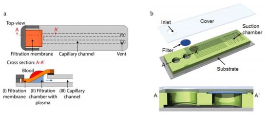 Applications of the dead-end filtration, (a) top-view and cross-section of Hauser et al.’s design, (I) a porous filtration membrane, (II) a filtration chamber and (III) the capillary channel; (b) microfiltration device integrated into a vertical-up flow channel, a membrane filter was positioned on the top of the vertical-up flow channel for filtration [,]. (a) reprinted with permission from Analytical Chemistry, High-Yield Passive Plasma Filtration from Human Finger Prick Blood, Janosch Hauser, Gabriel Lenk, Jonas Hansson, Olof Beck, Göran Stemme, and Niclas Roxhed, 2018, 90, 22, 13393–13399. Copyright (2018) American Chemical Society. Figure 5b republished with permission of the Royal Society of Chemistry, from Lab on a Chip, Hemolysis-free blood plasma separation, Jun Ho Son, Sang Hun Lee, Soongweon Hong, Seung-min Park, Joseph Lee, Andrea M. Dickey and Luke P. Lee, 14, 2287, 2014; permission conveyed through Copyright Clearance Center, Inc.
