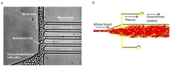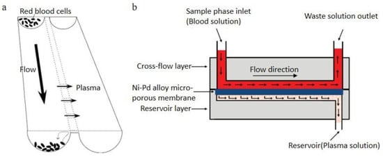 Cross-flow filtration, (a) principle of plasma separation from whole blood in the microchannel; (b) schematic of Yeh et al.’s cross-flow filtration method [,]. (a) reprinted with permission from Analytical Chemistry, Simultaneous Separation, Metering, and Dilution of Plasma from Human Whole Blood in a Microfluidic System, Tomoya Tachi, Noritada Kaji, Manabu Tokeshi, and Yoshinobu Baba, 2009, 81, 3194–3198. Copyright (2009) American Chemical Society. (b) republished with permission of IOP Publishing, Ltd, from Journal of Micromechanics and Microengineering, Using the developed cross-flow filtration chip for collecting blood plasma under high flow rate condition and applying the immunoglobulin E detection, Chia-Hsien Yeh, Chia-Wei Hung, Chun-Han Wu and Yu-Cheng Lin, 24, 095013, 2014; permission conveyed through Copyright Clearance Center, Inc.