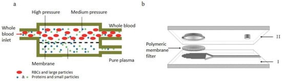 Aran et al. []. reported a membrane micro-filtration device using cross-feeding blood flow, the membrane filtration was sandwiched between two PDMS microchannels as Figure 7a. Two PDMS layers were adhered by surface modification of the polymer membrane via 3-aminopropyltriethoxysilane (APTES). They experimented with the sheep blood with various HCT levels (42%, 34%, 30% and 20%), the results showed that the separation rate decreased with experiment time when using the 42% HCT sheep blood. However, over the duration of the experiments using 20% to 34% HCT blood samples, the blood plasma separation was effective. Thorslund et al. []. reported a device with hydrophilic polypropylene (PP) membrane filter integrated between two PDMS slabs, shown in Figure 7b. The membrane filter had 0.4–0.45 μm pores. As addressed by Thorslund, the limitation of this device is the RBCs leakage caused by too high lid structure, and the leakage issue could not be significantly improved by sealing. Therefore, the best solution to improve this microsystem is to handle as large blood volumes as possible. Devices with the high lid design would face the same issues. Only diluted blood under 20% hematocrit (Hct) could be used to avoid this problem. This device ran on a PP device to prevent hemolysis and blood cell leakage in the separation process.