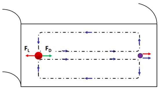 Particles suspended in the spiral microchannel experience the inertial lift force caused by the microchannel cross-section and the dean drag force due to the Dean vortices, shown in Figure 8. Inertial lift force: