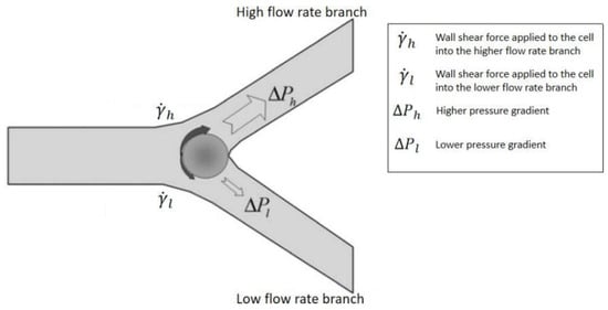 Bifurcation law also called the Zweifach-Fung effect, describes when the blood flowing in the capillary and passing through a bifurcating region, the RBCs in the blood flow into the higher flow rate daughter vessel. In contrast, only a few RBCs flow into the lower flow rate daughter vessel []. This effect will occur when the flow rate ratio between two daughter channels is above the critical ratio: 2.5:1. The diameter of the channel wall should not be too much larger than the diameter of cells []. As Figure 10 shows, at the bifurcation region, the asymmetric shear forces are applied on the cell’s surface due to the flow rate difference and produce a torque to pull it into the high flow rate channel [].