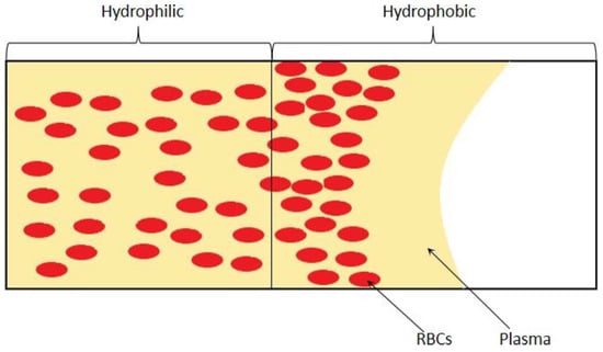 The passive self-separation microfluidic channel’s blood flow is driven by capillary force induced by hydrophilic channel walls []. Researchers designed a microchannel with different hydrophilicity patterns to separate plasma based on this principle, as can be appreciated in the Figure 11 that shows. Asymmetric channel with 3 sides hydrophilic in the front part of the channel and a hydrophobic patch with all walls hydrophobic is applied followed with the hydrophilic part. When the blood sample is introduced into the channel inlet, with the hydrophilic channel walls and Young-Laplace pressure, the blood flow into the microchannel as a capillary-driven flow. With the large contact angle and the inverse direction Young-Laplace pressure, the blood flow is impeded at the hydrophobic region. Since the viscosities of blood plasma and blood cells are different, the plasma has a higher velocity in the hydrophobic patch than the blood cells and passes through the hydrophobic region. Meanwhile, the blood cells stop and accumulated. In this technique, the asymmetric hydrophilic channel walls provide a gentler velocity decrease when the whole blood flow downstream [], and the velocity could be controlled by the contact angle of the channel walls [].