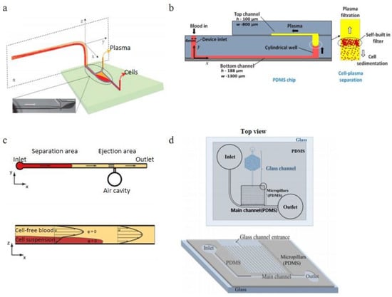 Sedimentation Applications, (a) schematic for the principle of the plasmapheresis device; (b) schematic of the device structure, plasma extraction due to the sedimentation and self-build-in filter; (c) two device structures: separation and ejection, and the illustration of the separation principle; (d) top view (top) and 3D schematics (bottom) of Park et al.’s blood separator [,,,]. (a) reprinted with permission from Analytical Chemistry, Gravitational Sedimentation Induced Blood Delamination for Continuous Plasma Separation on a Microfluidics Chip, Xian-Bo Zhang, Zeng-Qiang Wu, Kang Wang, Jie Zhu, Jing-Juan Xu, Xing-Hua Xia, and Hong-Yuan Chen, 2012, 84, 8, 3780–3786. Copyright (2012) American Chemical Society. (b,c) reprinted from [,] under the terms of the Creative Commons CC BY license. (d) reprinted by permission from Springer Nature Customer Service Centre GmbH: Springer, Microsystem Technologies, 22, 2077–2085 (2016), On-chip whole blood plasma separator based on microfiltration, sedimentation and wetting contrast, Sanghoon Park, Roxana Shabani, Mark Schumacher, Yoon-Seoung Kim, Young Min Bae, Kyeong-Hee Lee, Hyoung Jin Cho, Springer-Verlag Berlin Heidelberg 2015, (2015).