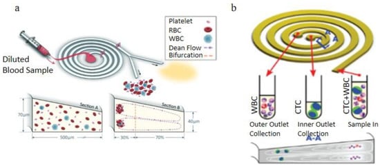 Spiral microchannel with trapezoidal cross-section, (a) schematic of the blood plasma separation using a spiral channel with a trapezoidal cross-section, blood cells concentrated near the inner channel wall around the vortex cores; (b) The operating principle of blood cells separation by a spiral channel with a trapezoid cross-section, CTCs focused near the inner channel wall and WBCs are trapped closer to the outer channel wall [,]. (a) republished with permission of the Royal Society of Chemistry, from Lab on a Chip, Multiplexing slanted spiral microchannels for ultra-fast blood plasma separation, Mehdi Rafeie, Jun Zhang, Mohsen Asadnia, Weihua Li and Majid Ebrahimi Warkiani, 16, 2791–2802, 2016; permission conveyed through Copyright Clearance Center, Inc. (b) reprinted from [] under the terms of the Creative Commons CC BY license.