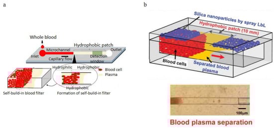 In self-driven flow microfluidic devices, modified channel surfaces could provide a velocity gradient of blood flow due to their viscosity difference, separating the blood cells and the plasma. Maria et al. []. designed a passive self-separation microfluidic channel with different hydrophilicity on its surface. As shown in Figure 16a, they added a hydrophobic patch after the hydrophilic surface-treated microchannel. Since the viscosities difference of plasma and the blood cells are significant, plasma had a higher flow velocity than the blood cells in the hydrophilic channel. Therefore the plasma could pass through the hydrophobic region meanwhile the blood cells stopped. Thus, plasma successfully separated from the whole blood. In their approach, 450 nL plasma could be extracted in 15 min and the purity of the plasma was comparable with that obtained using the centrifugation process. They also provided experimental data for the microchannels with various surface contact angles. They finished the comparison experiments on the all-wall hydrophilic and asymmetric (bottom is hydrophobic and other walls are hydrophilic) microchannel. Lee et al. []. used the microfluidic channel driven by asymmetric capillary flow. The microchannel was made of cyclic olefin copolymer (COC), which was naturally hydrophobic. To control the asymmetric capillary flow in the microchannel, a spray layer-by-layer (LbL) nano-assembly layer was sprayed on the top surface, which was supposed to be super hydrophilic but left a hydrophobic region. All other three walls (the bottom and two sides walls) were untreated and kept hydrophobic, as shown in Figure 16b. By comparing the microchannels with different hydrophobic patch lengths and channel widths, a maximum of 100 nL plasma was separated from the device with the 100 μm width and 10 mm hydrophobic patch.