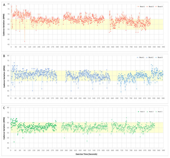 Representative time series data of pedaling cadence from one subject for baseline pedaling using a low-cadence target (60 RPM) with no feedback or engagement (A), real-time feedback of cadence performance (B) and video-based engagement (C). Shown are three 5-min bouts of the 15-min pedaling sessions, which included a 30 s rest break between each bout. The light-yellow shading indicates the target speed range within which the participants were asked to maintain their cadence.