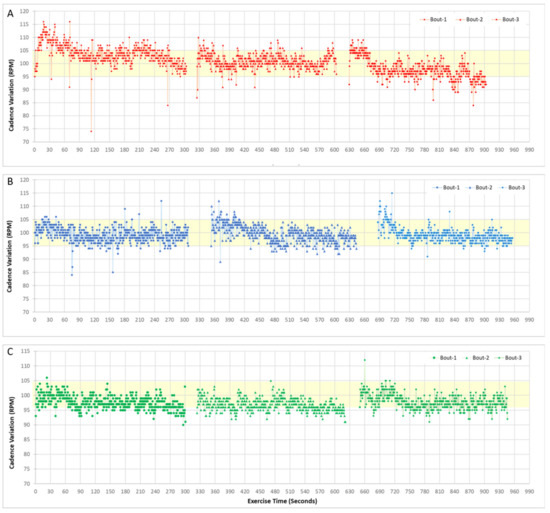 Representative time series data of pedaling cadence from one subject for baseline pedaling using a high-cadence target (100 RPM) with no feedback or engagement (A), real-time feedback of cadence performance (B) and video-based engagement (C). Shown are three 5-min bouts of the 15-min pedaling sessions, which included a 30 s rest break between each bout. The light-yellow shading indicates the target speed range within which the participants were asked to maintain their cadence.