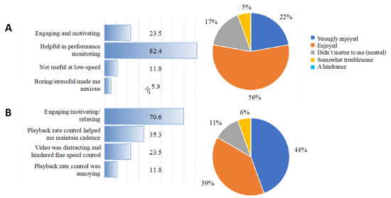 Categorization of post-exercise survey data into participant’s experience of pedaling with (A), feedback only compared to baseline pedaling (B) and video-based engagement compared to baseline pedaling.