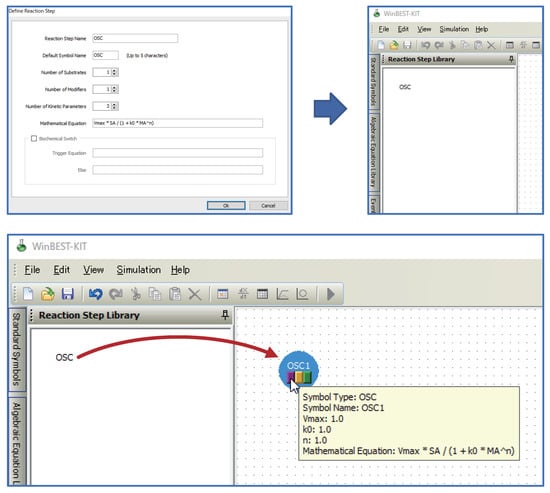 Figure 2. The kinetic equation labeled “OSC” can be registered in the symbol selection area in WinBEST-KIT. - Algebraic equations (AssignmentRule) and events, the characteristic features of SBML, can be used as user-defined symbols.Users can define algebraic equations and events as user-defined symbols and customize them into the diagrammed modeling interface through the same interface as used in the definition of the kinetic equations shown in Figure 2; that is, the custom algebraic equation symbols and the custom event symbols can be used in WinBEST-KIT. These features are called “Algebraic Equation Library” and “Event Library,” respectively. Users can visually arrange any number of the custom algebraic equation symbols and the custom event symbols anywhere in the editing area at any time, similar to the custom reaction step symbols;