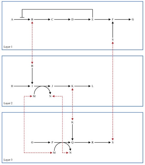 Example of the layer representation of the metabolic pathway shown in Figure 3. The red dashed lines indicate how each layer is connected through the reactants.