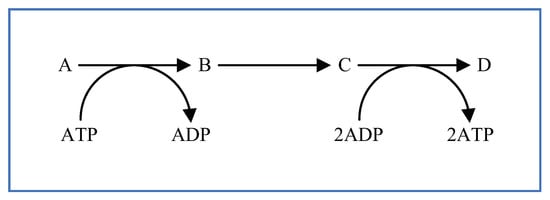 Additionally, reactants having the same name are arranged across many different places to more clearly represent the metabolic pathways, making them easier to understand. Arranging reactants in this way illustrates that the same reactants are utilized or produced in various reaction mechanisms in the same metabolic pathways. For example, ATP, ADP, NAD, NADH, and so on, are arranged across many different places in the same metabolic pathway. Furthermore, despite having the same name, their stoichiometric coefficients can differ depending on the reaction mechanisms. Figure 5 shows a typical example of a reaction mechanism that can be seen throughout the metabolic pathways. In Figure 5, ATP and ADP are arranged in the reaction mechanism of the first reaction step and their stoichiometric coefficient is 1. ATP and ADP are also arranged in the reaction mechanism of the third reaction step and their stoichiometric coefficient is 2. As a more practical example, 2ATP and ATP, 2ADP and ADP, 2NAD and NAD, and 2NADH and NADH can be arranged within the glycolysis pathway.