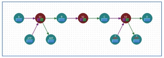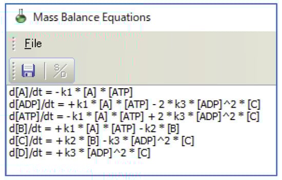 Consider the creation of a reaction scheme according to the metabolic pathway shown in Figure 5. In this case, one molecule each of ATP and ADP are involved in the first reaction step, and two molecules each of ATP and ADP are involved in the third reaction step. In other words, the number of molecules involved in the reaction mechanism (i.e., the stoichiometric coefficient) differs between the first and third reaction steps. Although the shortcut symbols have synchronized the values for the properties of their corresponding target reactant symbols, the stoichiometric coefficient can be set independently, as mentioned in Section 4. Figure 6 shows the reaction scheme corresponding to Figure 5 created using WinBEST-KIT. In Figure 6, ATP and ADP, arranged in the lower left corner by using the reactant symbols, are involved in the reaction mechanism of the first reaction step; their stoichiometric coefficient is 1. ATP and ADP, arranged in the lower right corner by using the shortcut symbols, with red symbol names, are involved in the reaction mechanism of the third reaction step; their stoichiometric coefficient is 2. The stoichiometric coefficients of each reactant symbol and shortcut symbol are also displayed above the symbol name. Note that such a value is not displayed when the stoichiometric coefficient is 1; see the reactant symbols in the first reaction step. Figure 7 shows the mass balance equations derived automatically from the reaction scheme created in WinBEST-KIT shown in Figure 6. Note that the “^” operator in the mass balance equations indicates exponentiation. As shown in Figure 6 and Figure 7, the stoichiometric coefficients of the shortcut symbols of ATP and ADP involved in the third reaction step have been applied to the derived mass balance equations; thus, reaction schemes with layouts similar to metabolic pathways depicted in biochemical textbooks can be created in WinBEST-KIT.