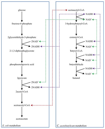 Metabolic pathways of synthetic butanol production using synthetic biology techniques. Acetoacetyl-CoA, NAD, and NADH with unique stoichiometric coefficients appear in both Escherichia coli and Clostridium acetobutylicum metabolisms. Dashed lines indicate the connection of these two different metabolisms through these reactants.