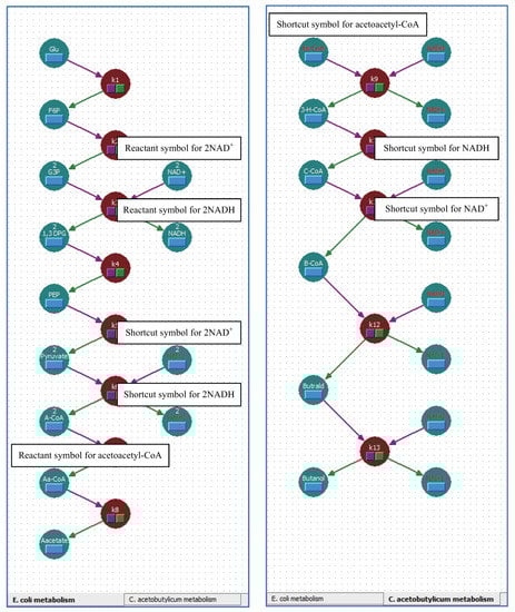 Reaction scheme corresponding to Figure 8 created using WinBEST-KIT. Reactant symbols and shortcut symbols with unique stoichiometric coefficients can be connected between Escherichia coli and Clostridium acetobutylicum metabolisms in different layers.