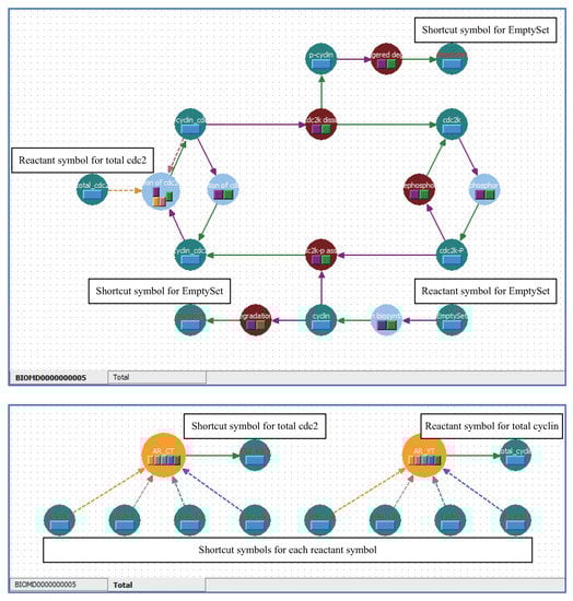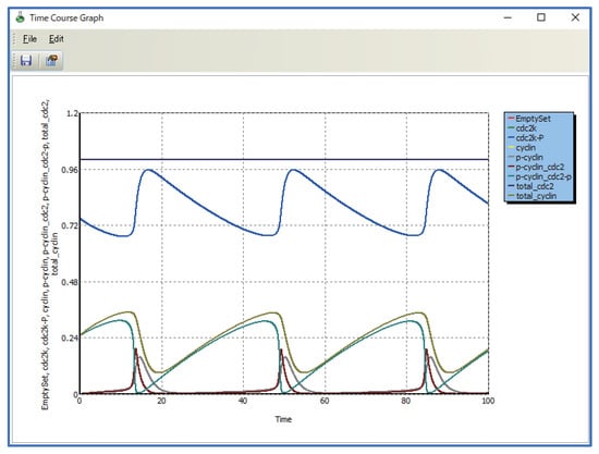 Complicated models written in SBML can be imported into WinBEST-KIT. The representation of complicated models in the diagrammed modeling interface inevitably has poor visibility. Figure 10 shows a screenshot immediately after importing into WinBEST-KIT the SBML model “BIOMD0000000005_url.xml,” which describes the cell division cycle model published by Tyson (1991) [] and stored in BioModels Database No. 5 (https://www.ebi.ac.uk/biomodels/BIOMD0000000005, (accessed on 1 August 2021)). As shown in Figure 10, there are many symbols and their connections are complicated, making this model difficult to understand. Other simulators adopting a diagrammed modeling interface have a similar difficulty. This model has two algebraic equations (AssignmentRule) to calculate the total concentration of cyclin and the total concentration of cdc2, respectively. We will arrange these algebraic equations on a different layer to better understand this model more easily through using the shortcut symbols. Furthermore, symbols representing the relationship between cyclin and cdc2 in the cell can be rearranged according to the reference by using shortcut symbols. The ability to visually arrange algebraic equations as symbols is one of the particularly notable features of WinBEST-KIT []. Figure 11 shows the created reaction scheme. In the layer labeled “Total” in the lower panel of Figure 11, the algebraic equation (orange) symbol arranged on the left side can be used to calculate the total concentration of cdc2; the four shortcut symbols labeled “cdc2k,” “cdc2k-p,” “p-cyclin_cdc2,” and “p-cyclin_cdc2-p,” are connected as the variables, and the shortcut symbol labeled “total_cdc2” is connected in order to substitute the calculation result (i.e., ). Similarly, the algebraic equation symbol arranged on the right side can be used to calculate the total concentration of cyclin; the four shortcut symbols labeled “cyclin,” “p-cyclin,” “p-cyclin_cdc2,” and “p-cyclin_cdc2-p” are connected as variables, and the reactant symbol labeled “total_cyclin” is connected in order to substitute the calculation result (i.e., ). It is particularly important that the corresponding target reactant symbol of each shortcut symbol is arranged on a different layer labeled “BIOMD0000000005” (the upper panel of Figure 11). Furthermore, in the layer labeled “BIOMD0000000005,” the reactant symbol labeled “EmptySet” indicates amino acids in the reference; the shortcut symbols make it possible to arrange the multiple EmptySet symbols according to the reference. Figure 12 shows the simulation result of Figure 11, which can obtain the same result simulated using CellDesigner and COPASI. Although the symbols representing the relationship between cyclin and cdc2 in the cell and the algebraic equations for calculating the total concentration of cyclin and the total concentration of cdc2 are arranged on different layers, WinBEST-KIT can treat them as a single integrated model. Thus, calculating the total concentration of cdc2 can be understood to involve the concentration of the four reactants on the different layers, and its result is then used in the calculation of the relationship between cyclin and cdc2 in the cell on a different layer. Accordingly, users can understand complicated models written in SBML easily by using the shortcut symbols and layers in WinBEST-KIT, because users can decide how to divide the models into layers and then analyze the layers as a single integrated model.