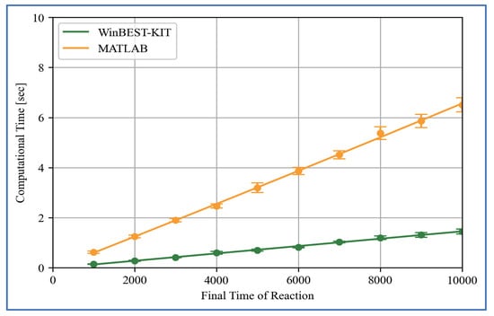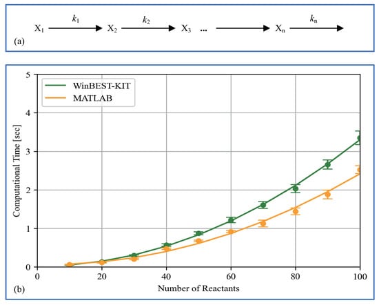To solve non-linear simultaneous ordinary differential equations representing large-scale and complicated metabolic pathways, we have implemented an efficient numerical solution method called the Gear method [] in WinBEST-KIT. Furthermore, the numerical calculations in WinBEST-KIT can be performed faster using an external compiler as mentioned in Section 2 (6). We have examined the computational time in WinBEST-KIT in comparison with those in MATLAB using the published SBML model as mentioned in Section 5.3. The values of kinetic parameters are the same in the reference. The maximum step size of numerical integration is 0.1, which is the default value in WinBEST-KIT. We have measured the computational time with changing the final time of the reaction (, arbitrary time unit) on a PC (Xeon-1620V4 3.5GHz with 16GB memory). Figure 13 shows the comparison results of the computational time. As shown in Figure 13, even though the final time of the reaction becomes longer, the increase in the computational time is suppressed in WinBEST-KIT; the computational time in WinBEST-KIT have a good performance for this published SBML model. We have also examined the scalability with respect to the number of reactants. Figure 14a shows the linear subsequent reaction system. Fixed the final time of the reaction at 1000 (arbitrary time unit), the computational time have measured with changing the -value from to . The initial concentrations of reactants and are 100 (constant value) and 0, respectively. The rate constants are 0.1. The maximum step size of numerical integration is 0.1. Figure 14b shows the comparison results of the computational time with respect to the number of reactants, which has measured using the same PC for Figure 13. As shown in Figure 14b, the computational time is slightly faster with MATLAB, and the changes of the scalability is almost same. Thus, as shown in Figure 14, the computational time is slightly faster with MATLAB for the models of simple metabolic pathways, however, as shown in Figure 12 and Figure 13, the numerical calculations in WinBEST-KIT are effective for the models of large-scale and complicated metabolic pathways involving a high non-linearity.