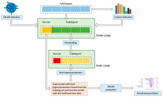 Data were divided into a training cohort (80% for DS1 and 70% for DS2), used to develop and train the ML algorithms and LR model, and a validation cohort (20% and 30%, respectively for DS1 and DS2) to ensure generalization of the model and prevent overfitting. Considering the relatively limited number of minority class patients available in the testing set, a stratified 20-fold Monte Carlo cross-validation (MCCV) [33] (Outer loop) was used for robust performance evaluation and to estimate model generalization. Cross validation is a common procedure to split data into a training set and a test set. MCCV represents an effective way to reduce the subsampling bias in the holdout procedure and the estimation variability in the test set [34,35]. The LR model was derived using a stepwise feature selection with backward elimination in a multivariate analysis for the identification of independent variables. Hyperparameters were determined by using a grid search analysis with stratified five-fold cross-validation on the training cohort (Inner loop) to optimize each ML model and determine the best value that led to the best performance in terms of F1 score: