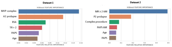 Accurate identification of patients at high risk of short- and long-term MV repair failure is important for correct surgical planning. Our findings demonstrated that a ML approach based on an XGboost algorithm can predict MV repair failure at 3Y with good discrimination and significant higher PPV than LR, whereas predicting early surgical outcomes of MV repair procedures is more challenging and further research is needed. Indeed, while MVP is the most common valvular pathology requiring surgery, little is known about the genetic mechanism responsible for the pathogenesis and progression of the valvular disease. Previous publications have identified statistically significant predictors of repairability and recurrence of MR but, to our knowledge, without testing the model’s performance [11,12,13,15,16,17,18]. We have extended earlier studies in this domain by comparing a variety of models and variable pools. ML algorithms, in combination with the traditional regression approach, may offer a valid tool for expanding clinical knowledge and improving indications for correct candidate selection for MV surgical repair. These improvements may be furthered by the continuous gathering of patient data and the relatively easily way to retrain the model to account for new predictors. Consequently, it is expected that ML techniques will become increasingly important in the future to improve prognostics approaches. The method developed in this study can be extended even to other clinical challenges.