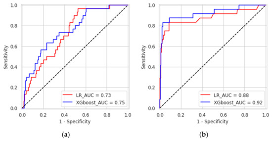 Receiver operating characteristic curves of the eXtreme gradient boosted trees and logistic regression for predicting causes of mitral valve repair failure and mitral valve regurgitation at one-month (a) and three years (b).