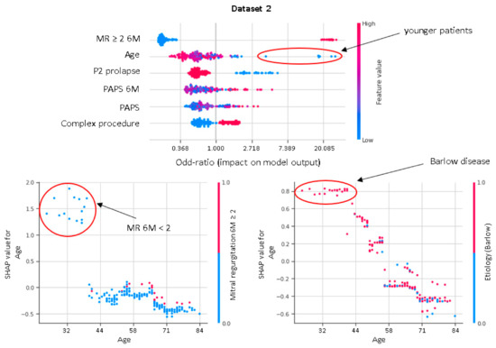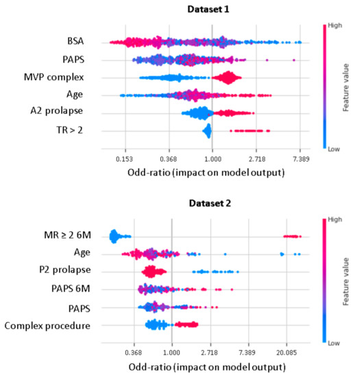 XGboost model obtained a better discrimination for MV repair failure than the LR, both in DS1 (AUC: XGboost 0.75 vs. LR 0.73) and DS2 (AUC: XGboost 0.92 vs. LR 0.88), as shown in Figure 3. For early MV repair failure identification, there was not a clear predominance among models in terms of PPV (PPV: XGboost 0.29 vs. LR 0.29). As regards the long-term follow-up for MR recurrence prediction, the best PPV was reached with the XGboost model (PPV: XGboost: 0.77 vs. LR: 0.70, p < 0.05). All the models had NPV of 0.95 or higher, and no improvement was observed in LR after resampling. RF and NB classifiers also consistently performed well, while other models were less robust to generalization. In Figure 4, for a global understating of the ML model, the effect of each feature on the learning-model prediction in terms of odd-ratio is shown.