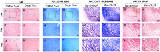 Histological analysis of hUAs (including native and decellularized samples). Native and decellularized hUAs stained with H&E (A,I,Q and B,J,R), TB (C,K,S and D,L,T), MT (E,M,U and F,N,V) and OS (G,O,W and H,P,X). The black boxes indicated the magnified field of 20× and 40× images. Images were presented with original magnification 10×, scale bars 100 μm, 20×, scale bars 50 μm and 40×, scale bars 25 μm. H&E: Hematoxylin and Eosin, TB: Toluidine Blue, MT: Masson’s Trichrome, OS: Orcein Stain.