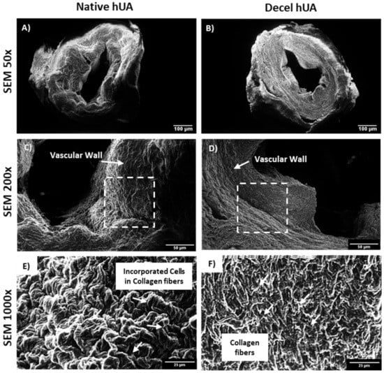 SEM histological analysis of hUAs. SEM images of native (A,C,E) and decellularized (B,D,F) hUAs. White arrows in images (A,D) represent the vascular wall. White squares in the same images represent the magnified region, as presented in images (E,F). White arrows in image E represent the combination of cells and collagen fibers of native, while in Figure F, white arrows represent only the preserved collagen fibers of decellularized hUAs. Images were presented with original magnification 50× (A,B), scale bars 100 μm, 200× (C,D), scale bars and 1000× (E,F), scale bars 25 μm.