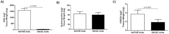 In the current study, DNA, hydroxyproline and sGAGs were quantified in order to properly evaluate the impact of the decellularization procedure on hUAs. Specifically, DNA was eliminated in decellularized hUAs. Specifically, the DNA content of the native hUAs was 1589 ± 150 ng DNA/mg of tissue weight. In the decellularized hUAs, the DNA content was 43 ± 6 ng DNA/mg of tissue weight, suggesting that 97% of the initial DNA content was removed (Figure 3A and Table S2).