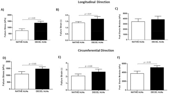 Biomechanical analysis of native and decellularized hUAs. Native and decellularized hUAs were tested for the maximum strain (A,D), failure strain (B,E) and peak elastic modulus (C,F), in the longitudinal (A–C) and circumferential (D–F) direction, respectively. Statistically significant differences between native and decellularized hUAs were found in failure stress (p < 0.05, in both directions), peak elastic modulus (p < 0.05, circumferential direction) and failure strain (p < 0.01 for the longitudinal direction and p < 0.05 for the circumferential direction). DECEL: Decellularized.