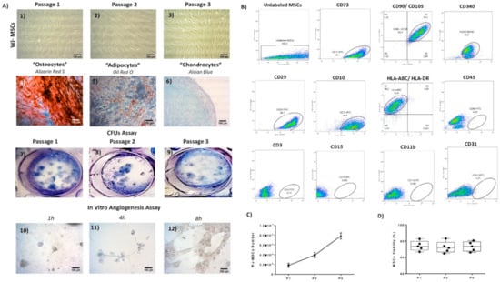 The WJ-MSCs at P1–P3 presented a fibroblastic-like morphology. No change in their morphological features was observed between the passages (Figure 6A). The WJ-MSCs P3 differentiated successfully to “osteogenic”, “adipogenic” and “chondrogenic” lineages upon stimulation with specific differentiation media. To determine the efficacy of the differentiation, histological stains were applied. Specifically, the mineral production (Ca2+ and Mg2+) from the differentiated WJ-MSCs were determined with the performance of Alizarin Red S. Indeed, a high number of calcium deposits to the differentiated “osteocytes” were observed (Figure 6A). Moreover, successful CFUs development was performed by the WJ-MSCs from P1–P3 (Figure 6A). The corresponded CFU numbers developed by the WJ-MSCs at P1, P2 and P3 were 12.3 ± 1.6, 12.1 ± 1.5 and 13.1 ± 1, respectively. No statistically significant differences regarding the CFU number were observed between the different WJ-MSCs passages (Figure S1). Additionally, to verify the WJ-MSCs’ properties to form an organized network, an angiogenesis assay was applied (Figure 6A). The WJ-MSCs started to develop the tubular networks after 4 h. An organized tubular network, formed by WJ-MSCs, was observed after 8 h of incubation.