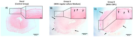 The WJ-MSCs P3 successfully repopulated the decellularized hUAs in both groups. However, a more uniform repopulation of the hUAs was observed when CBPL was used (Figure 7) Indeed, when CBPL was used as a supplement of the culture medium, a better distribution of the WJ-MSCs P3 was observed, compared to group A. H&E stain confirmed the presence of the WJ-MSCs P3 to the TA of hUAs in both groups (Figure 8). However, after 30 days of incubation, an extensive migration of cells from TA to TI was reported only in group B (Figure 8). The WJ-MSCs P3 of group A did not migrate, thus they were located only in the TA of the hUAs. Moreover, a greater number of the WJ-MSCs P3 were observed in group B compared to group A.