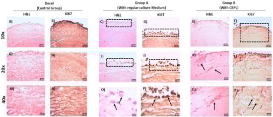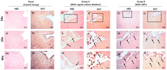 To further confirm the proliferative activity of the WJ-MSCs P3 in the repopulated hUAs, immunohistochemistry against Ki67 was performed (Figure 9). The expression of Ki67 was confirmed in both groups. However, a greater distribution of Ki67 was observed in group B, further confirming the H&E staining results.