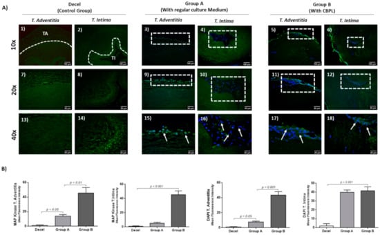 The immunofluorescence results indicated the expression of MAP kinase in both groups (Figure 10 and Figure S3). However, the greater distribution and expression of MAP kinase were observed in group B in comparison to group A (Figure 10). The MFI of the MAP kinase expression in TA and TI in repopulated hUAs of group A and group B was 13.9 ± 2.1 and 1.1 ± 0.3, and 45.6 ± 7.1 and 45.3 ± 5.1, respectively. Accordingly, for the DAPI stain, the MFI in repopulated hUAs of groups A and B were 7.6 ± 1.1 and 39.8 ± 2.5, and 43.4 ± 4.4 and 41.5 ± 4.3, respectively. The statistically significant differences were observed in the study groups, regarding either the MAP kinase expression (p < 0.01) or the DAPI stain intensity (p < 0.001). The latter further confirms the greater proliferative potential and migratory ability of the WJ-MSCs P3 in decellularized hUAs, when CBPL was also used as a supplement in the culture medium.