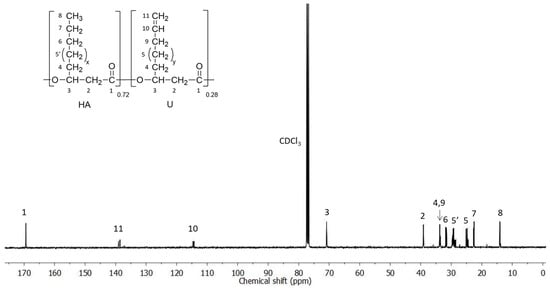 The ability of Pseudomonas raguenesii to produce unsaturated PHA (PHAU) was tested using coprah oil (5 g·L−1) that is a vegetable oil from coconut composed of more than 90% of saturated fatty acids, in mixture with 10-undecenoic acid (0.5 g·L−1) to induce PHAU production. After 72 h of culture, cells are harvested by centrifugation and PHAU is extracted from these freeze-dried pellets. After extraction and purification, PHAU production has a yield of 17% (w/w). The molar mass is 123,000 g.mol−1 with polydispersity index of 1.8. The 13C NMR spectrum of the polymer is shown in Figure 1 (HSQC spectrum is provided in the Supplementary Material, Figure S1). Chemical shifts of the C1 carbon (C=O) were detected at 169 ppm, that of C2 at 39 ppm and C3 at 71 ppm. C4 carbon of the side chain methylene groups is detected at 33 ppm. The chemical shifts at 14 ppm correspond to the terminal methyl groups (CH3) of the side chains and the chemical shifts observed between 22 ppm and 31 ppm correspond to the different methylene groups (CH2) of the side chains. The presence of a double bond is confirmed by the presence of peaks at 114 ppm and 139 ppm corresponding respectively to the methylene (=CH2) and methine (=CH–) groups of the double bond. The chemical shift at 34 ppm corresponds to the α-methylene groups of the double bond.