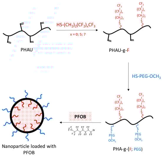 Our strategy is to incorporate perfluoroalkyl side chains in the PHAU to enhance its tendency to self-assemble through the formation of fluorophilic interactions between perfluorinated side chains. Moreover, PEG grafting onto PHAU was performed to generate stealth material against the immune systems. The interest in preparing these amphiphilic copolymers that are both covalently grafted by PEG and fluorinated groups is 2-fold. It allows one both to increase the PFOB encapsulation and to avoid aggregation of the nanoparticles. The synthetic route to PHA-g-(F; PEG) is given in Figure 2. Different fluorinated thiols were grafted on PHAU (Table 1) in order to evaluate the importance of the length of the grafted moiety on the signal detected by MRI. The molar ratio of thiol was adjusted so as to functionalize only a part of the available double bonds because the other part will be further used to graft PEG on the side chains of PHAU.